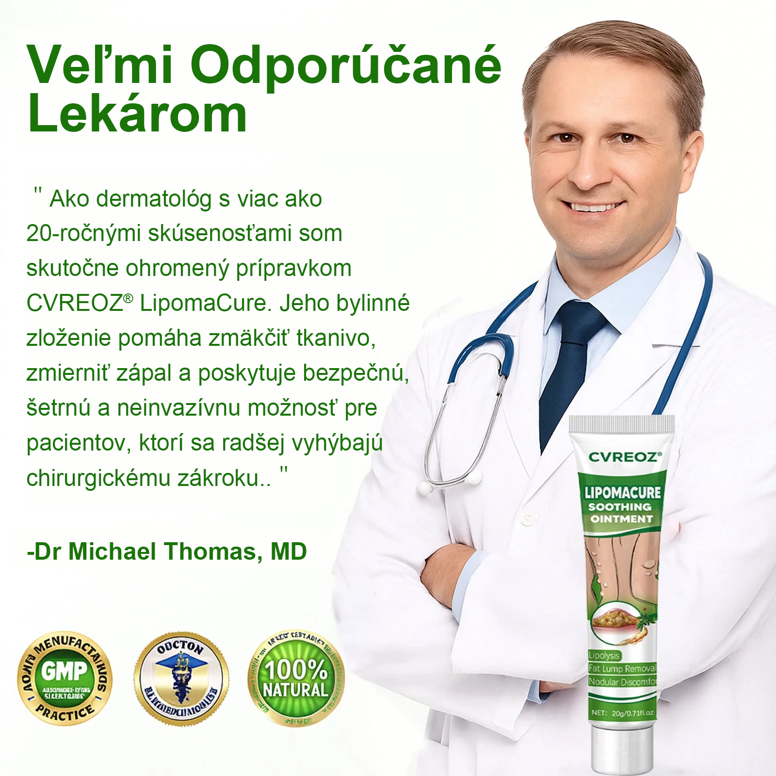 „Ako praktizujúci dermatológ s viac ako 20-ročnými skúsenosťami v liečbení benigných kožných útvarmov som bol ohromený klinickými výsledkami masti Cvreoz® LipomaCure Soothing Ointment. Jeho bylinná formula nielenže prispieva k zmäkčovaniu tkaniva a znižovaniu zápalu, ale ponúka aj neinvazívnu alternatívu pre pacientov, ktorí sa chcú vyhnúť chirurgickým zákrokom. Je nežný, bezpečný a vykazuje skutočný potenciál pre domáce použitie.“